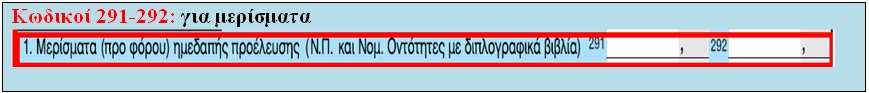 Εδώ δηλώνονται τα κέρδη που διανέμουν οι ημεδαπές εταιρίες όλων των νομικών μορφών, περιλαμβανομένων και των προσωπικών εταιριών που τηρούν διπλογραφικά βιβλία, πριν από την αφαίρεση του φόρου 10%. Ο φόρος που παρακρατήθηκε στα παραπάνω ποσά, γράφεται στους κωδ. 293-294.
