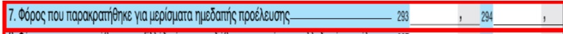 Δηλώνεται ο φόρος που έχει παρακρατηθεί από την ημεδαπή εταιρία που πραγματοποίησε την διανομή κερδών-μερισμάτων που γράφηκαν πιο πάνω στους κωδ. 291-292 και διενεργήθηκε παρακράτηση 10%.