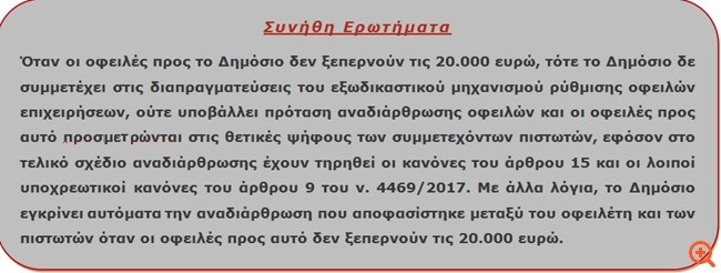 * Ποιες οφειλές προς το Δημόσιο υπάγονται στην εξωδικαστική ρύθμιση οφειλών του νόμου 4469/2016: Σύμφωνα με την παράγραφο 4 του άρθρου 2 του νόμου, με τη σύμβαση αναδιάρθρωσης οφειλών του ν. 4469/2017 μπορούν να ρυθμιστούν οφειλές προς πιστωτές του αιτούντος που έχουν γεννηθεί έως και την 31η Δεκεμβρίου 2016. Ειδικά όσον αφορά τις οφειλές προς το Δημόσιο, αυτές μπορούν να υπαχθούν σε σύμβαση αναδιάρθρωσης, μόνο εφόσον είναι ήδη βεβαιωμένες στις 31 Δεκεμβρίου 2016. Το ίδιο ισχύει για τις οφειλές υπέρ τρίτων πιστωτών που βεβαιώνονται και εισπράττονται από τη Φορολογική Διοίκηση σύμφωνα με τις διατάξεις του Κ.Ε.Δ.Ε. Οι ανωτέρω οφειλές προς το Δημόσιο και υπέρ τρίτων υπολογίζονται με τις προσαυξήσεις ή τόκους εκπρόθεσμης καταβολής επ' αυτών κατά το χρόνο υποβολής της αίτησης για υπαγωγή στο νόμο, σύμφωνα με το άρθρο 4 αυτού (μπορούμε να συμπεράνουμε πως αν στις 31 Δεκεμβρίου 2016 υπήρχε ληξιπρόθεσμη οφειλή αξίας 19.500 ευρώ και τον Νοέμβριο του 2017 λόγω προσαυξήσεων ξεπεράσει τις 20.000, η οφειλή αυτή μπορεί να ενταχθεί στον εξωδικαστικό μηχανισμό. Όπως είναι γνωστό, οφειλές κάτω των 20.000 ευρώ δεν εντάσσονται στον μηχανισμό αυτόν). Επισημαίνεται ότι σύμφωνα με την παράγραφο 7 του άρθρου 2 του νόμου και το άρθρο 7 της Α.Υ.Ο. ΠΟΛ.1105/2017 δεν αποτελούν αντικείμενο σύμβασης αναδιάρθρωσης βεβαιωμένες οφειλές οι οποίες αφορούν σε ανάκτηση κρατικών ενισχύσεων που χορηγήθηκαν με τη σύσταση ειδικών αφορολόγητων αποθεματικών σύμφωνα με τις διατάξεις της παραγράφου 1 του άρθρου 22 του ν. 4002/2011 ή σύμφωνα με άλλες ειδικές διατάξεις. Το Δημόσιο δε συναινεί σε διαγραφή απαιτήσεών του, με την έννοια της παρ.2 του άρθρου 15 του ν.4469/2017 για βασική οφειλή από τελωνειακούς δασμούς της Ευρωπαϊκής Ένωσης οι οποίοι ως παραδοσιακοί ίδιοι πόροι, αποτελούν έσοδό της και αποδίδονται στον Ευρωπαϊκό Προϋπολογισμό, ακόμη και σε περίπτωση διαγραφής τους (άρθρο 1 παρ.3 της ΑΥΟ 1105/2017). Αντίθετα, κάθε οφειλή από φόρο εισοδήματος, Φ.Π.Α., ΕΝΦΙΑ και ασφαλιστικές εισφορές εντάσσεται κανονικά.