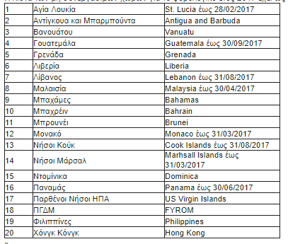 Η λίστα των μη συνεργάσιμων χωρών για το φορολογικό έτος 2017 έχει ως εξής: