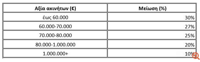 Τα εκκαθαριστικά του ΕΝΦΙΑ αναμένεται να φορτωθούν στο taxisnet το αργότερο έως το ερχόμενο Σαββατοκύριακο. Ο φόρος θα είναι μειωμένος για όλους τους ιδιοκτήτες. Για να διαπιστώσει ένας ιδιοκτήτης πόσο λιγότερο ΕΝΦΙΑ να πληρώσει φέτος μπορεί να κάνει τα εξής: θα πρέπει να ανατρέξει στο περυσινό εκκαθαριστικό του ΕΝΦΙΑ και να δει την συνολική αξία της ακίνητης περιουσίας του. Με βάση αυτήν θα εφαρμόσει έναν μειωτικό συντελεστή στο συνολικό ποσό του ΕΝΦΙΑ. Ο μειωτικός συντελεστής καθορίζεται από την παρακάτω κλίμακα: