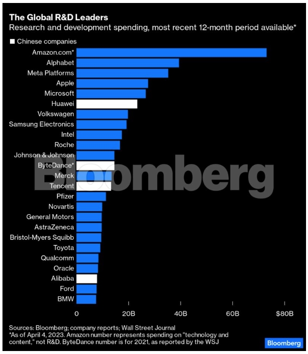 Πλέον δίπλα της έχουν προστεθεί η ιδιοκτήτρια του TikTok, ByteDance, η ιδιοκτήτρια του WeChat και κολοσσός των τυχερών παιχνιδιών Tencent και ο γίγας του ηλεκτρονικού εμπορίου, των ηλεκτρονικών πληρωμών και πάροχος υπηρεσιών υπολογιστικού νέφους (cloud) Alibaba. Το ποσό των 14,6 δισεκατομμυρίων δολαρίων για την ByteDance αφορά το 2021 και προέρχεται από μια έκθεση την οποία η μη εισηγμένη εταιρεία μοιράστηκε με υπαλλήλους της πέρυσι, στην οποία έκανε αναφορά η Wall Street Journal τον Οκτώβριο. Σύμφωνα με πληροφορίες, την 1η Απριλίου ότι η ByteDance είπε στους επενδυτές ότι τα έσοδα αυξήθηκαν κατά 30% το 2022, οπότε υποθέτω ότι οι δαπάνες της για R&D το 2022 θα κατατάσσονταν ακόμη υψηλότερα.