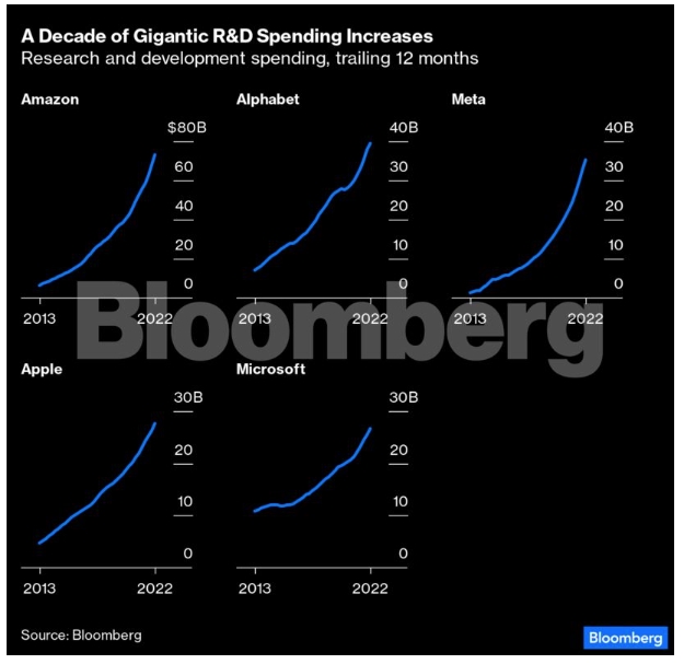 Στις ΗΠΑ, οι περισσότερες από αυτές τις εταιρείες έχουν ανακοινώσει μεγάλα κύματα απολύσεων τον τελευταίο καιρό, ωστόσο η επίδραση στις δαπάνες τους για R&D είναι μέχρι στιγμής μετά βίας διακριτή.