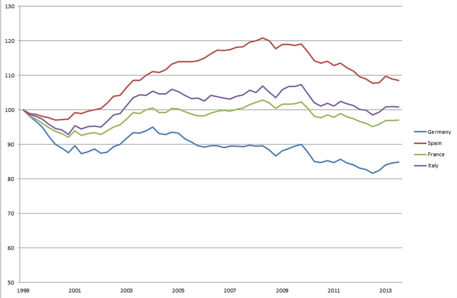Η Κομισιόν συντάσσει τους λεγόμενους «εναρμονισμένους δείκτες ανταγωνιστικότητας» για τις οικονομίες της ευρωζώνης (διάγραμμα ένα). Αυτοί είναι μόνο κατ’ όνομα οι πραγματικές συναλλαγματικές ισοτιμίες των κρατών-μελών. Εμφανίζουν ότι της Γερμανίας υποχώρησε κατά σχεδόν 20% στο διάστημα από την αρχή του 1999 μέχρι το τέλος του 2011, προτού ανέβει λίγο στο 2012-2013. Ο κύριος λόγος για την πτώση στην πραγματική συναλλαγματική ισοτιμία της χώρας ήταν οι πολύ χαμηλές αυξήσεις των μισθών και ως εκ τούτου, ο χαμηλός πληθωρισμός. Οι πραγματικές συναλλαγματικές ισοτιμίες της Ισπανίας (και σε μικρότερο βαθμό) της Ιταλίας, αυξήθηκαν ραγδαία στις αρχές της δεκαετίας του 2000 αλλά έχουν υποχωρήσει από το 2008: της Ιταλίας είναι τώρα ελάχιστα υψηλότερη από ό,τι το 1999, ενώ της Ισπανία βρίσκεται υψηλότερα περίπου κατά 9%. Η πραγματική συναλλαγματική ισοτιμία της Γαλλίας είναι στην πραγματικότητα χαμηλότερη τώρα από ό,τι ήταν το 1999 (ή με βάση την ανάλυση της Κομισιόν), η ανταγωνιστικότητά της έχει βελτιωθεί. Εν συντομία, οι ανισορροπίες της ευρωζώνης δεν έχουν σχέση με τα μέλη της λατινικής σχολής που επιτρέπει στο κόστος να ξεφύγει από τον έλεγχο, από ό,τι με τη γερμανική σχολή της μείωσης του κόστους.