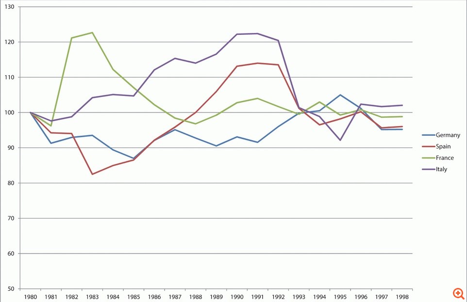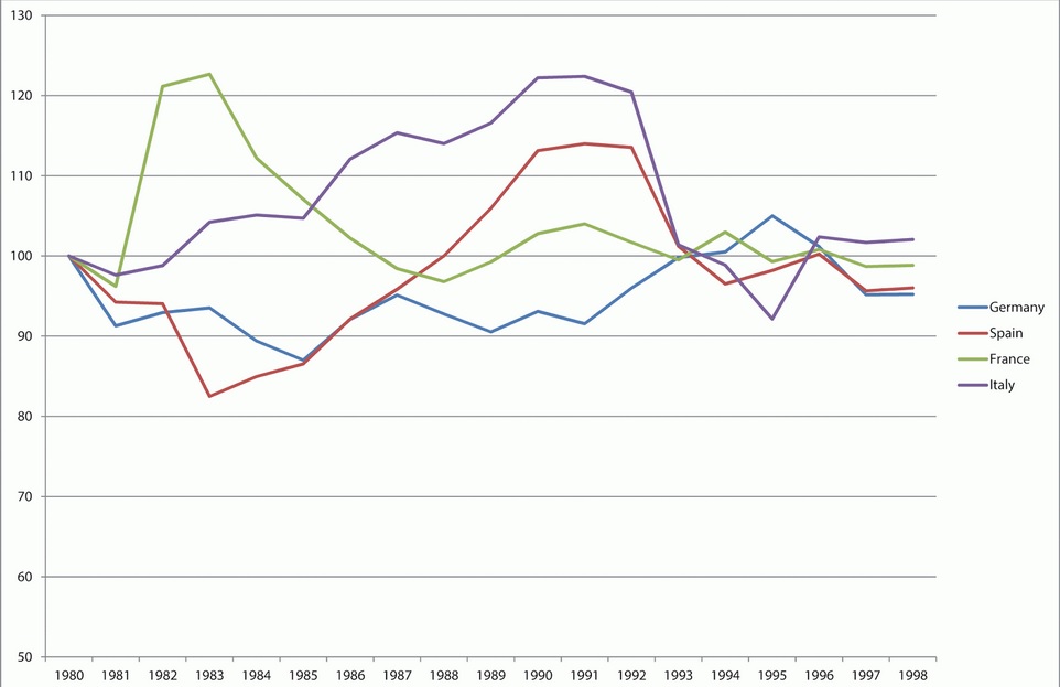Στο βαθμό που η βαθιά πτώση της πραγματικής συναλλαγματικής ισοτιμίας της Γερμανίας εντός της ευρωζώνης αναγνωρίζεται στις Βρυξέλλες και στο Βερολίνο, παραδοσιακά αποδίδεται στην ανάγκη να αντιστραφεί η άνοδος της πραγματικής συναλλαγματικής ισοτιμίας της χώρας στην πορεία προς την εισαγωγή του ευρώ. Οι γερμανικές επιχειρήσεις, με βάση αυτό το επιχείρημα, χρειαζόταν να επανοικοδομήσουν την ανταγωνιστικότητά τους μετά από το σοκ της επανένωσης, που οδήγησε στην πτώση της πραγματικής συναλλαγματικής ισοτιμίας. Το πρόβλημα με αυτή την ανάλυση είναι ότι δεν επιβεβαιώνεται από τα δεδομένα. Το δεύτερο γράφημα παρακάτω εμφανίζει τις πραγματικές συναλλαγματικές ισοτιμίες της Γερμανίας, της Γαλλίας, της Ισπανίας και της Ιταλία στο διάστημα μεταξύ 1980-1998. Της Γερμανίας ήταν στην πραγματικότητα χαμηλότερη το 1998 από ό,τι ήταν το 1980. Υπήρξαν υποτιμήσεις στη Γαλλία στο διάστημα 1983-1984, και στην Ιταλία και στην Ισπανία μετά από την αποχώρησή τους από τον Μηχανισμό Συναλλαγματικών Ισοτιμιών (ERM) το 1992, αλλά σε κάθε περίπτωση αυτές οι υποτιμήσεις ήταν εν πολλοίς διορθωτικές (σε απάντηση των κρίσεων υπερτίμησης των νομισμάτων) και μέχρι το 1998 οι πραγματικές συναλλαγματικές ισοτιμίες τους βρέθηκαν πάλι εκεί όπου ήταν το 1980. Στη διάρκεια της συνολικής περιόδου, η Γερμανία ήταν αυτή που είχε την πιο «ανταγωνιστικά αποτιμημένη» πραγματική συναλλαγματική ισοτιμία.