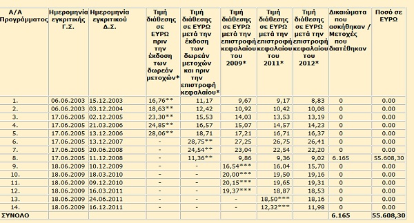 (*) Oι τιμές διάθεσης των μετοχών που εκδίδονται στα πλαίσια των ανωτέρω προγραμμάτων διάθεσης μετοχών με την μορφή δικαιωμάτων προαίρεσης αγοράς μετοχών, όπως αυτές είχαν αρχικά οριστεί από τις Γενικές Συνελεύσεις της Εταιρείας με ημερομηνίες 22.11.2001, 06.06.2003 και 17.06.2005 αντίστοιχα, αναπροσαρμόστηκαν συνεπεία της από 15.10.2007 αποφάσεως της Έκτακτης Γενικής Συνέλευσης της Εταιρείας για την διανομή δωρεάν μετοχών. Oι τιμές διάθεσης των μετοχών αναπροσαρμόστηκαν εκ νέου συνεπεία της από 16.10.2009 αποφάσεως της Έκτακτης Γενικής Συνέλευσης της Εταιρείας και των από 06.05.2011 και 25.06.2012 αποφάσεων των Ετήσιων Γενικών Συνελεύσεων της Εταιρείας για την επιστροφή κεφαλαίου στους μετόχους της.